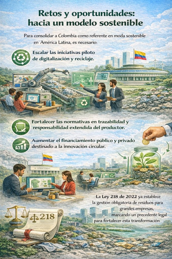 Durante el periodo 2023–2025, la industria textil colombiana ha experimentado avances significativos en automatización, inteligencia artificial, virtualización de procesos, uso de fibras circulares y gestión integral de residuos. Sin embargo, el impacto real de estas transformaciones dependerá del cierre de brechas en formalización, regulación, inversión y escalabilidad tecnológica. La convergencia entre políticas públicas, financiamiento estratégico, formación técnica y marcos normativos robustos será clave para consolidar un modelo textil verdaderamente sostenible, competitivo y circular en Colombia.