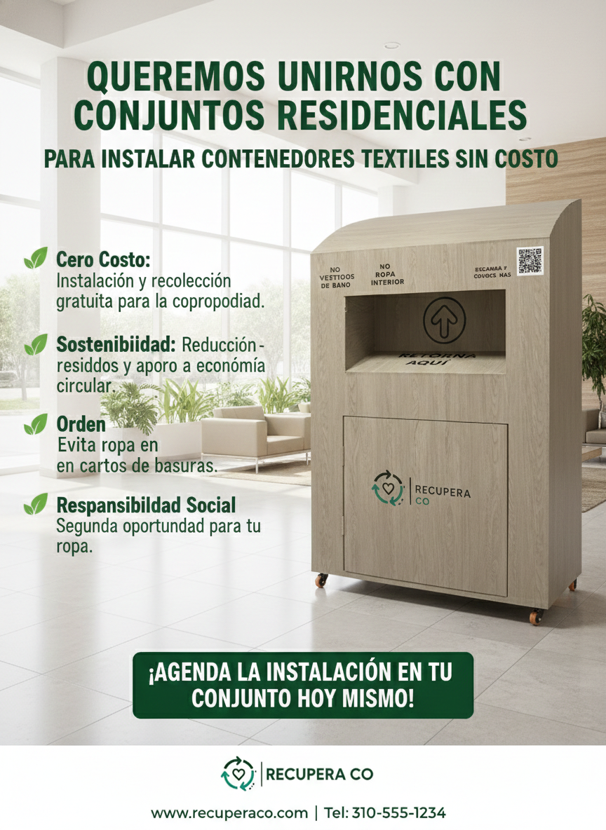 En Recupera Co creemos que las grandes transformaciones comienzan en los espacios donde vivimos. Por eso, hoy queremos unirnos con conjuntos residenciales que deseen dar un paso hacia la sostenibilidad mediante la instalación de contenedores para residuos textiles, sin ningún tipo de costo.